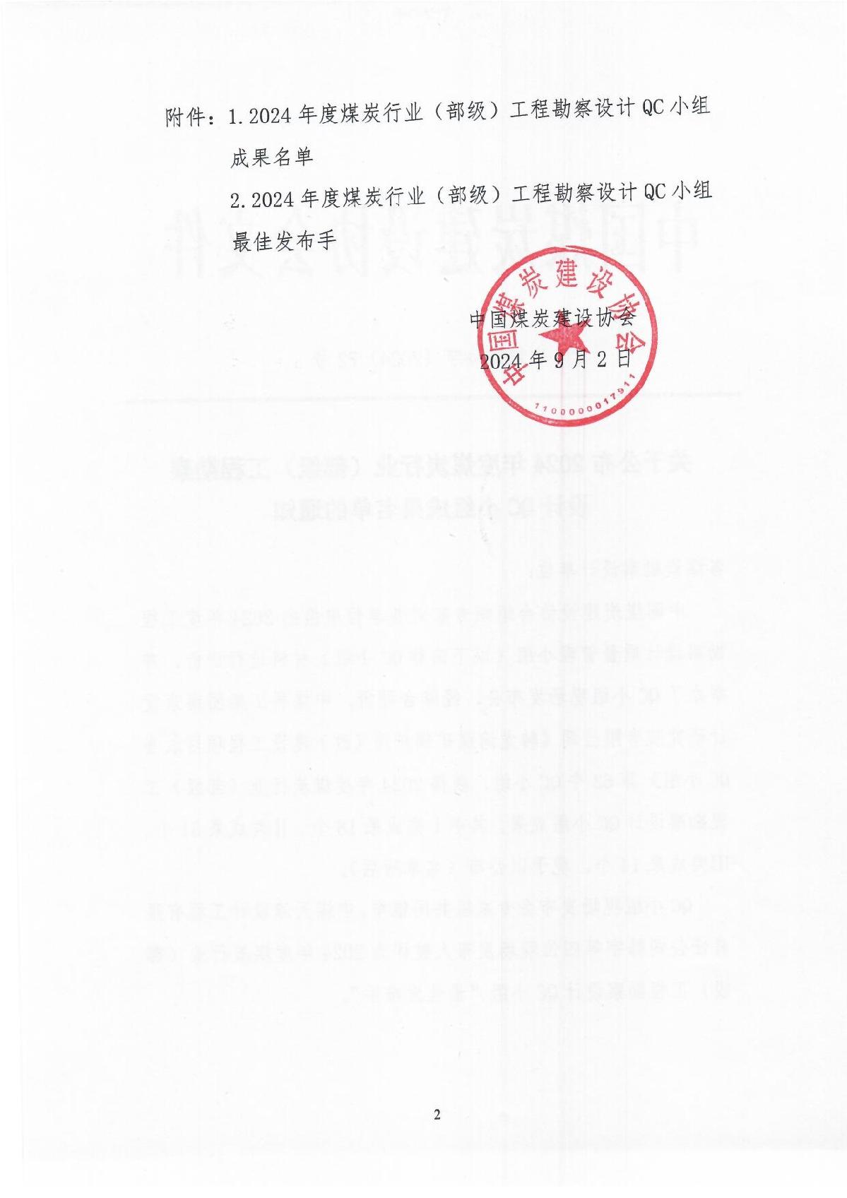 公布2024年度煤炭行业工程勘察设计QC小组通知